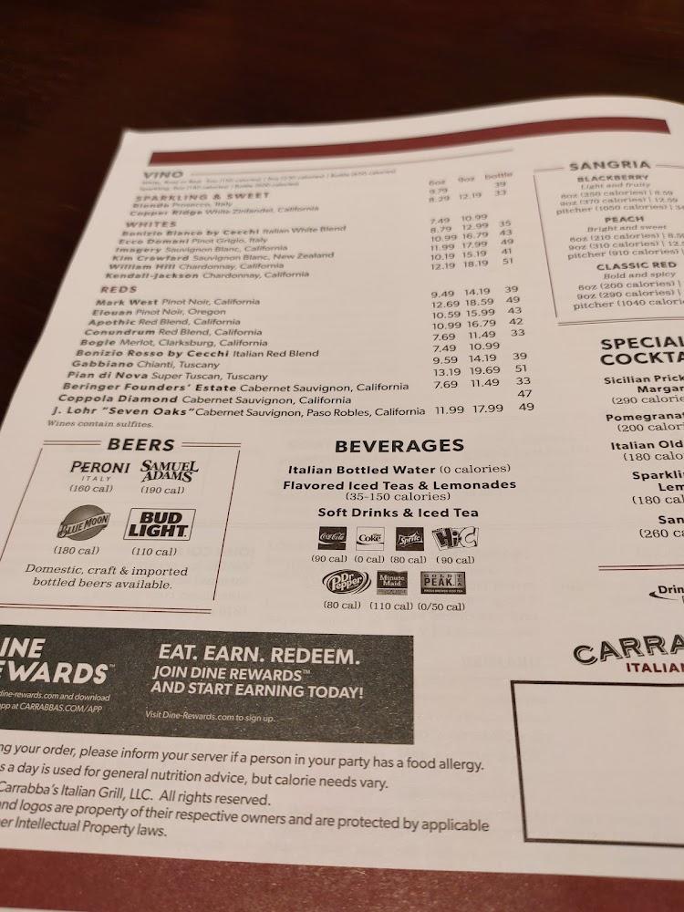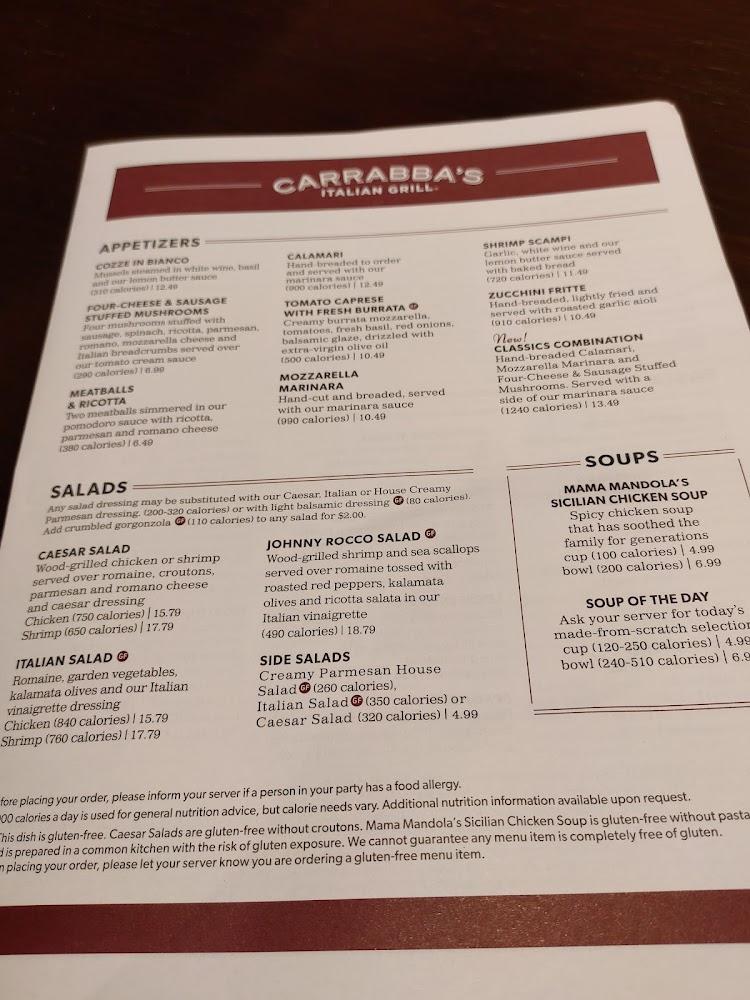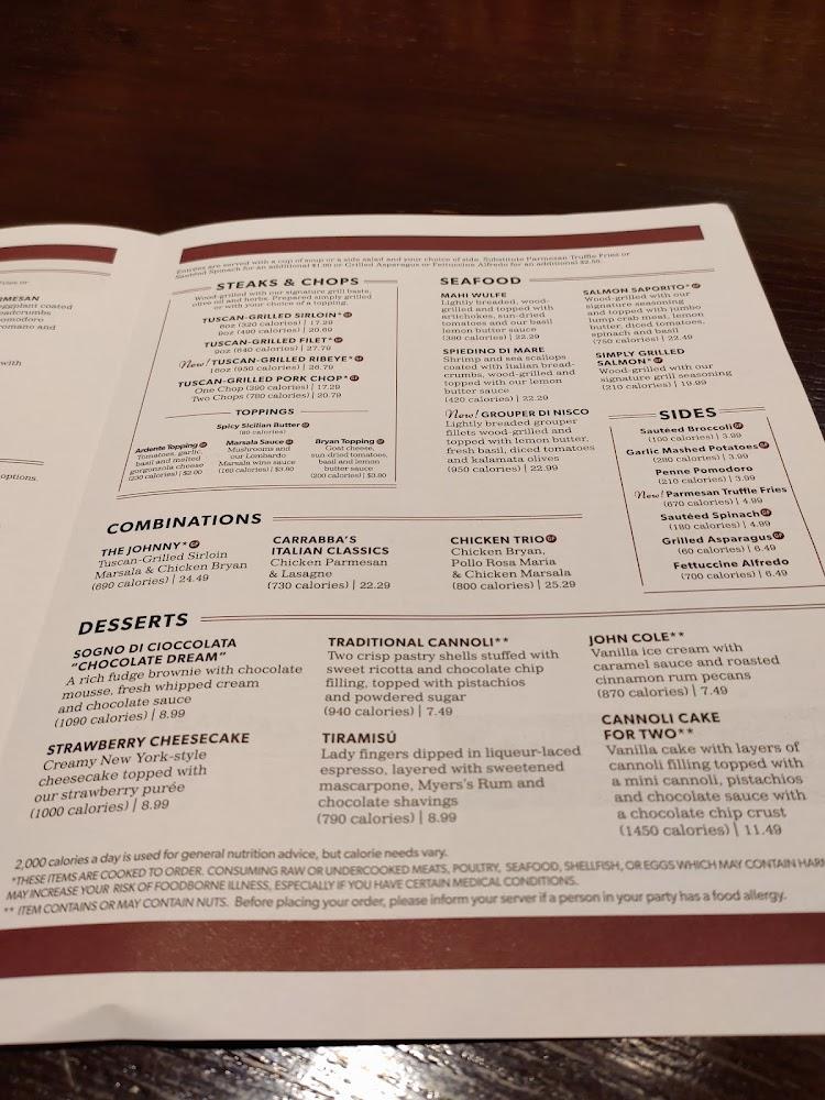 Carrabba's features an extensive menu with over 60 dishes, ensuring something for everyone.